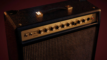 Close-up of a vintage guitar amplifier with gold knobs and a black textured cabinet.