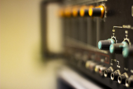 Close-up of the volume control of a music amplifier in a music recording studio with the background out of focus