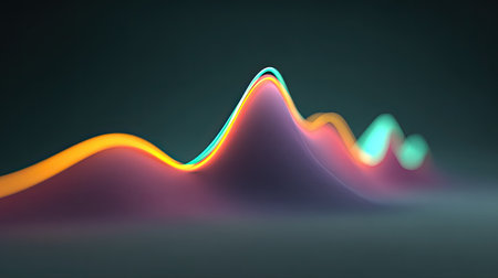 This abstract illustration presents a visualization of sound waves, rendered in vibrant colors. The design showcases a series of peaks and troughs, possibly depicting audio frequencies. The composition utilizes a gradient background and circular elements. It could be used for various design projects, including educational, commercial, or creative purposes.