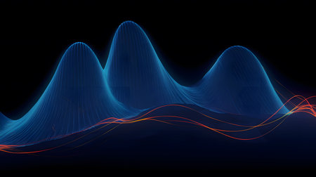 Curved digital waveform graph showing sharp peaks and smooth dips, glowing in a sci-fi blue hue.
