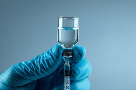Close up view of doctor’s hand with an ampule of covid vaccine on blue back