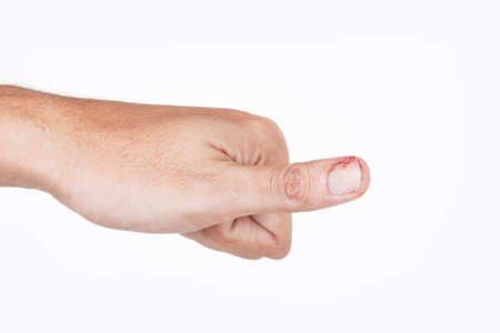 The finger was hit with a hammer had Injury with blood.
