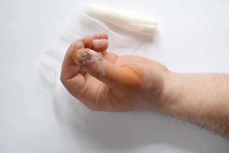 Male finger bandaged. Finger with a wound, injury. close-up.