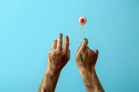 Hands of zombie with human eye on stick against color background