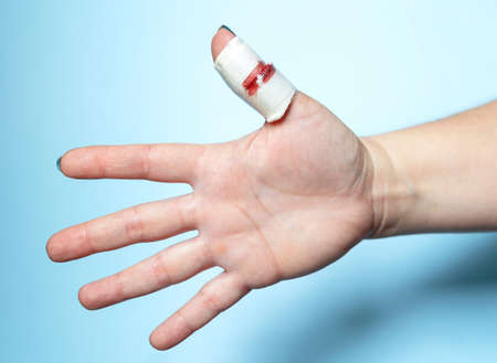Hand of an adult woman with a bleeding wound on the thumb of her right hand. Medical bandage, rubber fingertip. First aid in case of injury. Woman of the European race. Traces of blood in the palm of your hand.