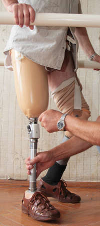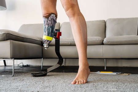 Amputee man with above knee leg prosthesis standing on feet, close up.