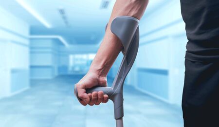 Medical Concepts and Ideas. Closeup of Man With Plaster on Legs Holding Crutches.Horizontal Image