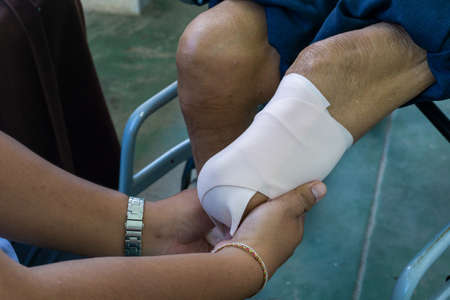 man's leg hurts. Patient receiving a first aid. Nurse bandaging a wound.