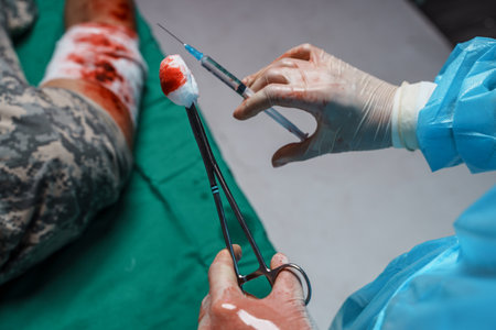 a doctor sews up a wound on the abdomen with a needle holder and surgical suture material