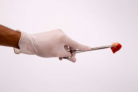 closeup, the hands of a nurses hand, an assistant surgeon takes a surgical instrument from a sterile table. In a sterile operating room. Removing a malignant tumor of the ear with a scalpel, suturing soft tissues, electrocoagulation, stopping bleeding. Plastic and reparative surgery. Oncology of children, surgery on the lymph nodes