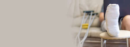 Teenager boy with injured broken leg in a plaster cast on the bed at home with crutches.