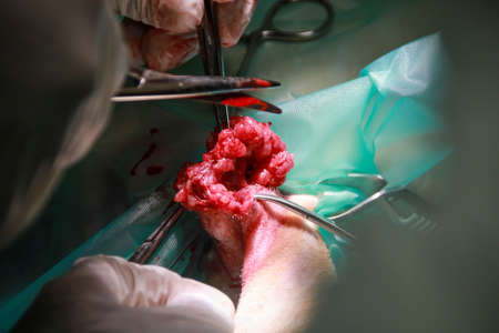 A Veterinary Surgeon removes a tumor from under the tail of a Labrador Retiever puppy