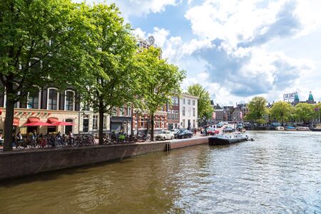 Amsterdam, Netherlands - July 02 2016: The traditional Dutch houses on Amstel street, sunny day