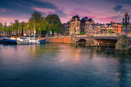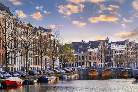 Stunning dutch cityscape with anchored boats in water canal at sunset, Amsterdam, Netherlands, Europe