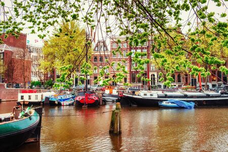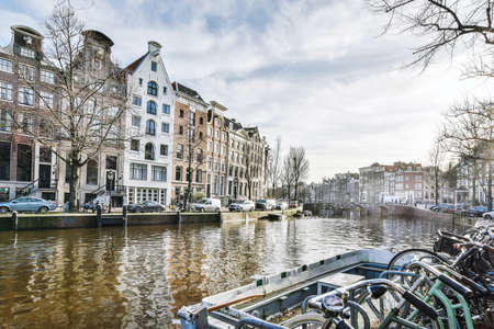 Amsterdam, Netherlands - March, 12, 2017. Scenic canal with traditional dutch architecture in Amsterdam, Netherlands