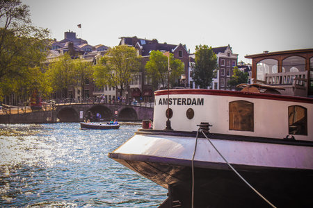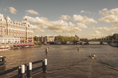 Canals of Amsterdam. Sunny panorama of river Amstel