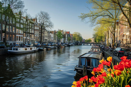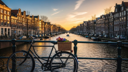 The romantic canals of Amsterdam in spring, Amsterdam canals with bicycles and flowers at sunset Ai generated