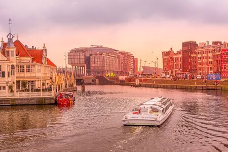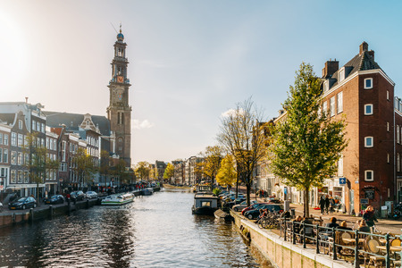 Amsterdam, Netherlands - April 2, 2016: Street view at sunset with traditional old houses, canal and boat