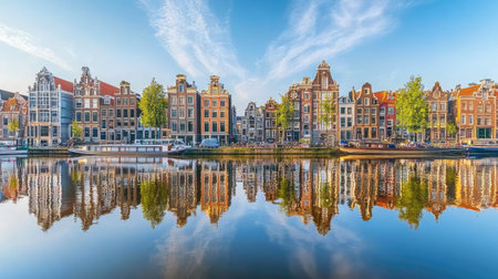 An urban scene with various buildings lining a riverside, their reflections mirrored perfectly in the water. Above, a beautiful, clear sky adds a sense of openness and tranquility.