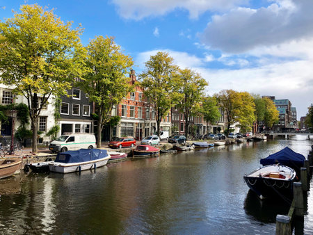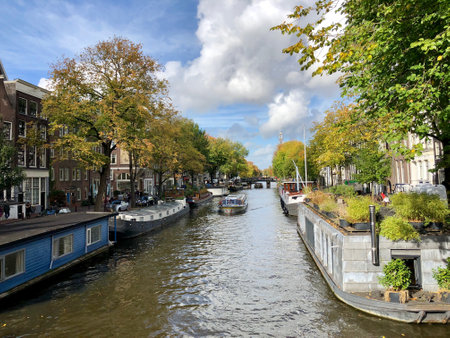Amsterdam, Netherlands 15 October 2019. Amsterdam canals with boats and typical houses. Travel.