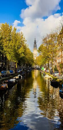 Picturesque Groenburgwal canal in Amsterdam with the Soutern church Zuiderkerk at sunset in early autumn