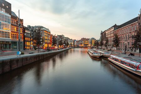 Beautiful Amsterdam city at evening time, Netherlands. Night illumination reflected in Amstel river.