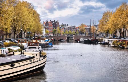 Netherlands Amsterdam. View at river Amstel with boats bridge and traditional houses. Picturesque city landscape. Autumn day in touristic urban with yellow tree.