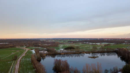 Aerial view of a beautiful and dramatic sunset over a forest lake reflected in the water, landscape drone shot. Blakheide, Beerse, Belgium. High quality photo