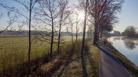Aerial view of an Idillic river stream canal with grass banks and wild flowers and trees in a scenic landscape on a misty sunny spring morning sunrise day, taken with a drone. High quality photo