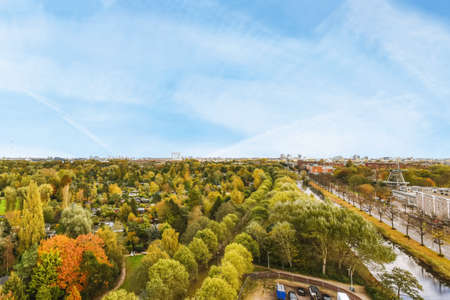 This is an aerial view of city Amsterdam, Netherlands in cloudy weather