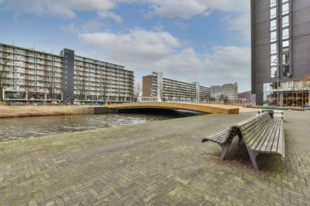 pedestrian bridge across a channel in residential neighborhood in Hamburg, Germany in warm evening sunlight