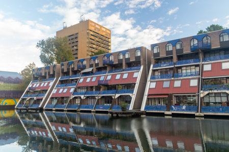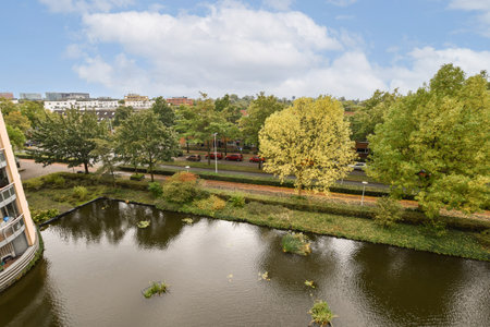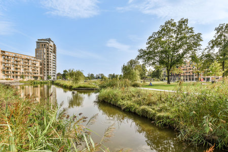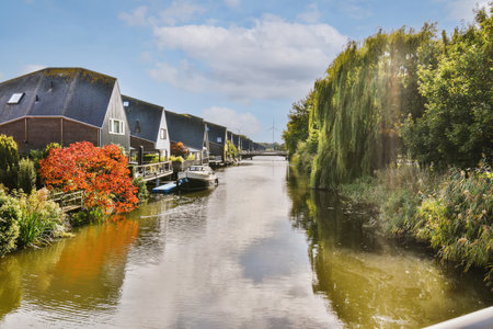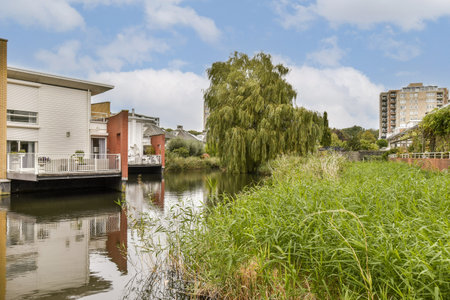 Charming residential buildings along a tranquil waterway, surrounded by lush greenery and a serene atmosphere. Ideal for peaceful living and nature lovers.