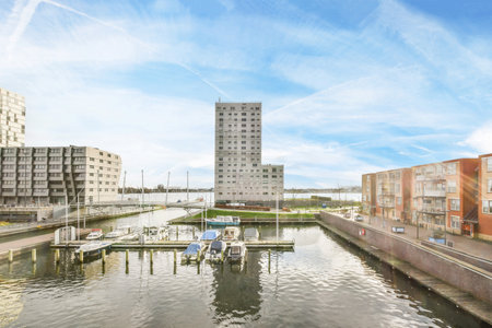 Contemporary apartment buildings standing tall against a blue sky, embodying modern urban living in Amsterdam