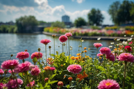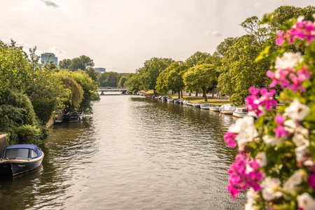 A picturesque canal view featuring lush green trees, blooming flowers, and calm water, creating a serene atmosphere perfect for relaxation and nature appreciation.