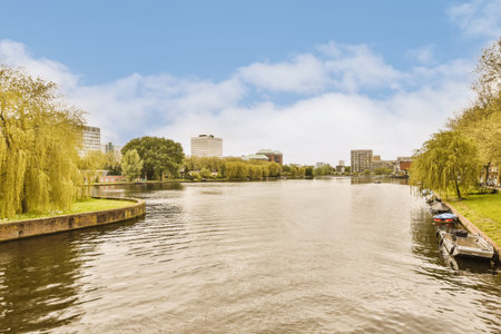 Amsterdam, Netherlands - 10 April, 2021: some boats in the water near trees and buildings with sun shining through the blue sky over them on a sunny day