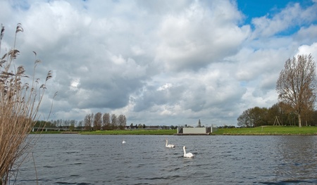 beautiful Dutch plain landscape with blue sky covered with white clouds