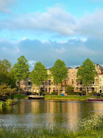 Panoramic view of a calm canal surface with clear blue sky in Leiden, the Netherlands. Bicycle road, houses in the background. Spring cityscape. Travel destinations, architecture, tourism, recreation