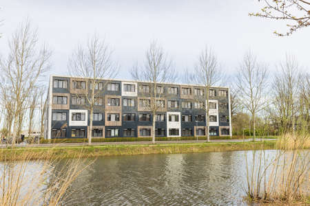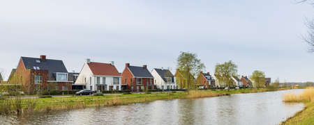 Row of modern newly build family houses along canal in Kortenoord in Wageningen, Gelderland in The Netherlands