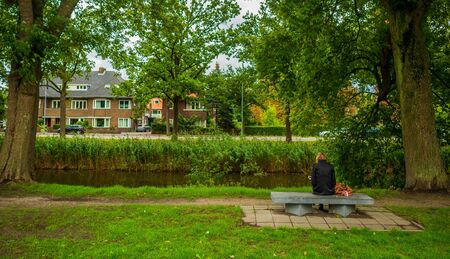 Breda, Netherlands - August 26, 2018: An unidentified female sitting on a bench at the park in Breda