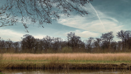 The reedy edge of a lake in a green grassy field in wetland in sunlight under a blue sky in winter, Almere, Flevoland, The Netherlands