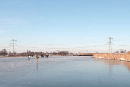 People ice skating of the Frozen water during winter 2021 in Zevenhuizen on the River Rotte