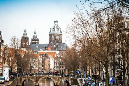 Amsterdam city with bikes on bridge against old cathedral during springtime in Netherlands.