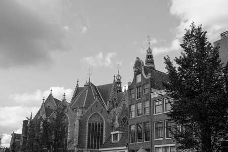 Amsterdam, Netherlands - April 20, 2017: Traditional dutch medieval buildings, beautiful architecture in Amsterdam