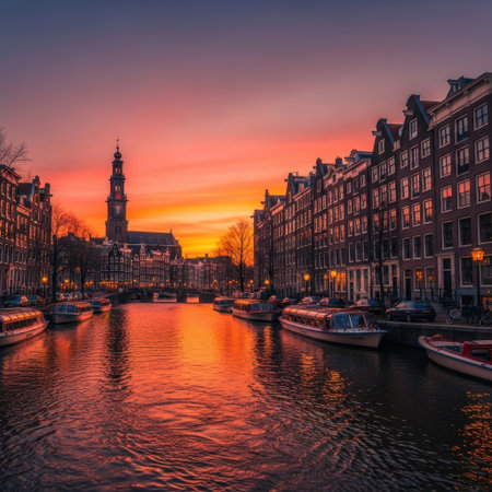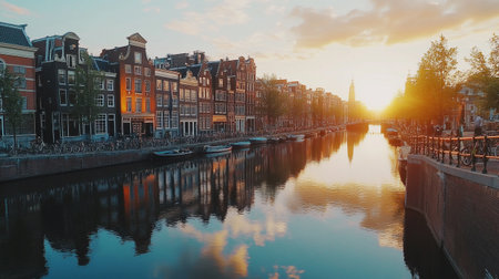 Tranquil Amsterdam canals at dawn, reflecting the city's charm