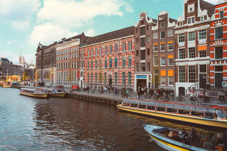 Amsterdam, Netherlands 15 October 2019. Amsterdam canals with boats and typical houses. Travel.