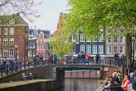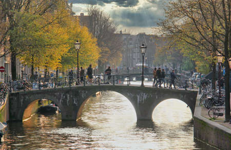 Amsterdam, The Netherlands - November 12, 2015: People walk on a bridge across a canal in historical Amsterdam, on November 12, 2015 in Amsterdam, The Netherlands.