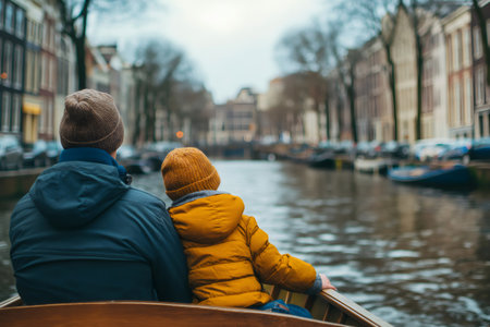 Father and son enjoying a peaceful boat trip along a picturesque canal in Amsterdam, Netherlands, creating lasting memories together