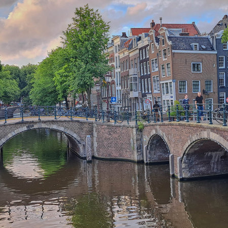 Canals in Amsterdam reflect beautiful architecture and greenery, while people stroll across a classic bridge, enjoying the peaceful evening ambiance.