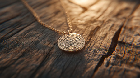 A close up of gold medal resting on polished wooden surface, reflecting light beautifully, symbolizing achievement and success