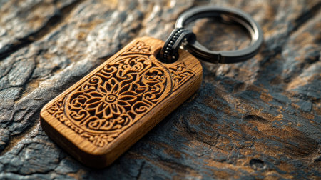 A beautifully crafted wooden keychain featuring intricate floral carvings, set against a rustic wooden background, highlighting craftsmanship and natural beauty.